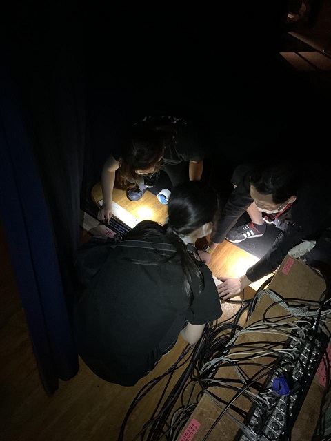 さて、照明部は毎回仕込み時に「シュート」というスポットライトを当てる場所を一つ一つ微調整していく作業をします。 私は「送り」という、調光室でフェーダーを上げ下げしてライトを点灯させる役割をしています。 みんなそれぞれのポジションでせっせと仕事!
