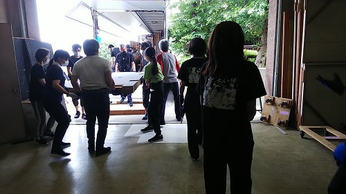 千葉の会館は道具の搬入口が舞台中央の奥にある珍しい会館です。 今日は仕込だけですが、鑑賞会の方々が道具の搬入作業に駆けつけて下さいました。助かりましたありがとうございます。