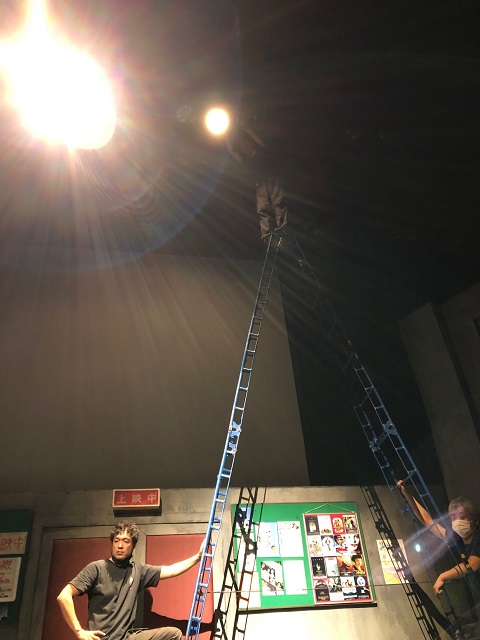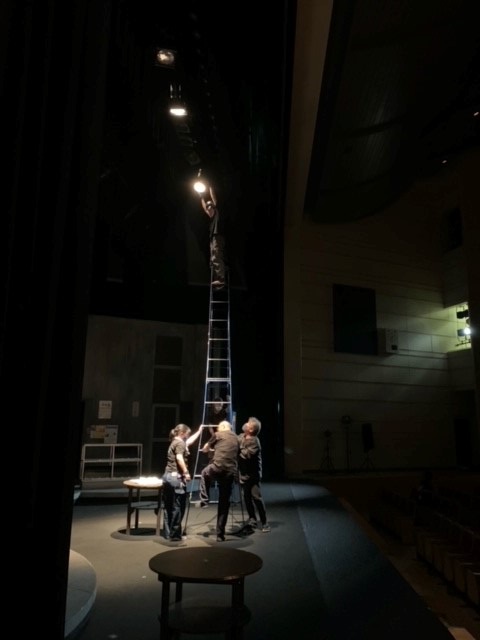 吊り込んだスポットを脚立に登って向きを変えて役者やセットに当たるようにします。 スタッフさんに舞台上にいてもらい、場面ごとに明るさの調整。