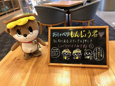 このホテルのロビーには「おしゃべりしんじょう君」というぬいぐるみがいます。「しんじょう君」に話しかけると、その言葉と同じ言葉を発しながら歩き出すんですよ〜。