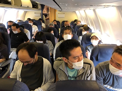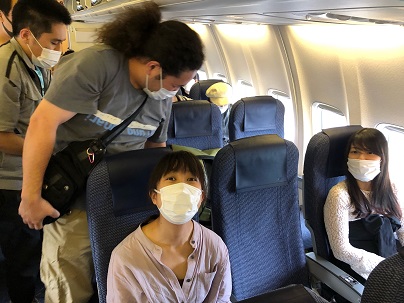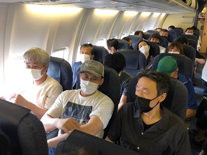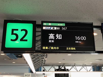 搭乗口の前で搭乗を待つメンバー。右から葛西さん、浦吉さん、(奥に)松田さん、八代さん、中津原さんです。 一行は16時発のANA567便で、いざ高知へ!