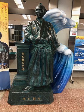 高知の空港は「高知龍馬空港」といいます。到着したら「高知と言えば坂本龍馬ぜよ!」と言わんばかりに龍馬さんの銅像が出迎えてくれました。 空港からホテルまでは貸し切りバスで移動。