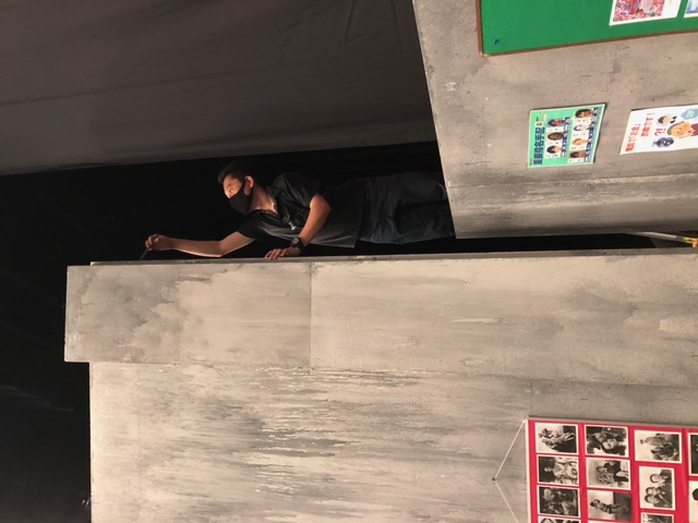 因みに…この写真はゲネプロ当日に舞台上のセットの補修作業を行う僕です。 場当たり直前に補修箇所を見つけてしまい、慌てて直し作業をしようとしながらもちゃっかり公演班便り用に写真を撮ってもらったなんて口が裂けても言えませんが、我々スタッフも本番に向けてこういう細かい作業を欠かさないという裏方ならではの報告でした。 盆を回し始める津曲海七斗 |