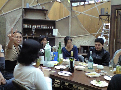 左端にいるのは劇団の白木匡子さん、みんなを紹介しています。