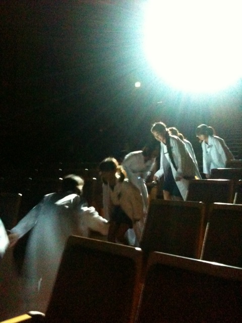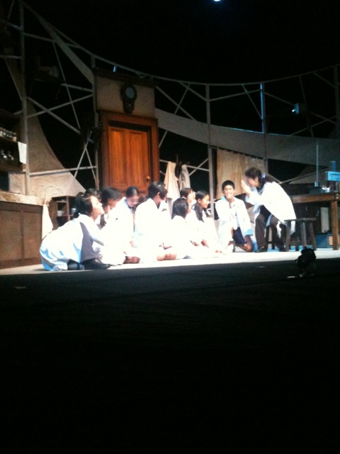 今日は4つの劇場の合同例会、観客数は840名。高学年例会だけど低学年も交じっていて、ケタケタと良く笑ってくれました。子ども劇場の公演は子どもから大人まで幅広い年齢層の方々が観てくださるので、微妙に反応する場所が違っていて演じる側も刺激的です。