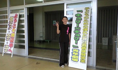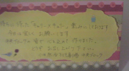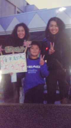 『お母さんと一緒に作りました(^o^)』と、〈歓迎・青年劇場キュリー×キュリー〉という看板を持った男の子が!!