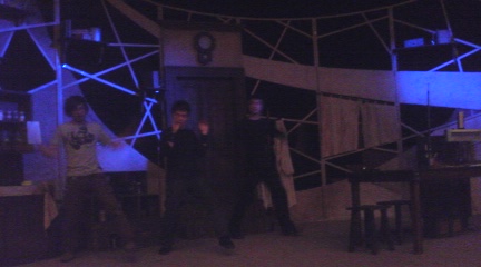 何やら舞台では、あやしげな動きをしている3人組が…。