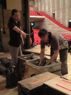 今旅から参加のライティングチーフ永友ちゃんと、照明だってバリバリの マリー江原。持込の照明機材をだしているところよ。