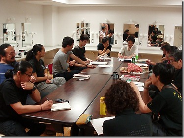 そこでまずは恒例の「総括会議」です。マジメでしょ!(^^)! シュッツ副班長がテキパキと進めます。 様々、率直な意見が出され、すべてはより良い創造のために!(^_^)v 気持ちを新たにして、さぁ、最後の舞台です! 神奈川県立青少年センター&NPO法人横浜こどものひろば主催による「第296回神奈川県青少年芸術劇場」公演二日目。