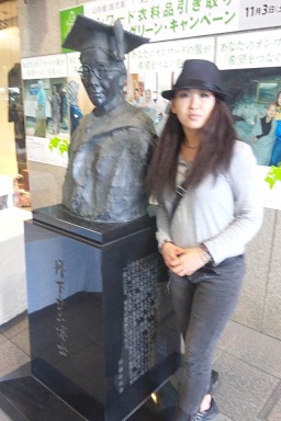 こちらは丹下梅子像。女性初の帝大生。すごい人なんです。 女性初のノーベル賞 マリーキュリー役の江原朱美との記念撮影。