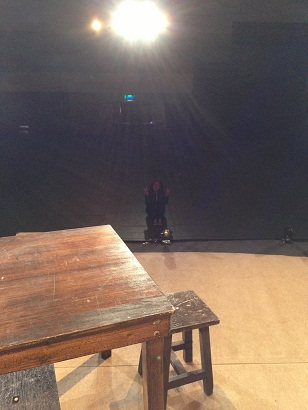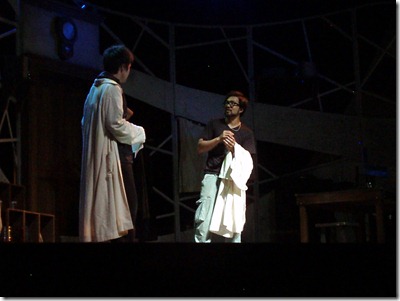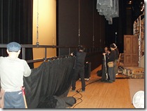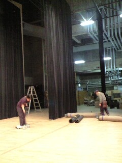 ラ・サール学園さんといえば、全国に名前のとどろく進学校ですが、毎年必ず演劇鑑賞は行われているし、文化祭や体育祭はじめ、多彩な行事でメリハリのある学校生活がとても魅力的な学校です。 青年劇場もこれまでたくさんの作品をご覧いただいてきました。 最近では2004年「ケプラーあこがれの星海航路」、2008年「3150万秒と、少し」、そして今回と、4年おきにお招きいただいています(^o^) さて!突然ですがココで問題です!!! 我がキュリー班は15人で動いていますが、この最近の3作品すべてに来ているメンバーが2人います。それはいったい誰でしょう(^_-)? 答えはこの報告の最後に。。。 な〜〜んて言ってるうちに開演時間が迫ってきました。 仕込みの作業と並行してお互いの芝居の確認をするビクロ岡山とピエール塚原。 舞台監督白石の指導の下、真剣です。
