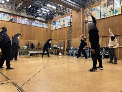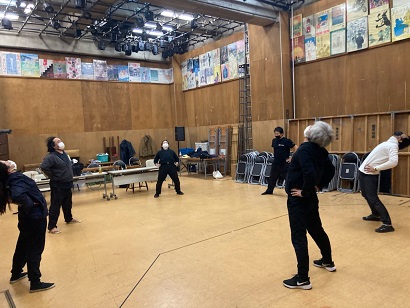 2022/1/27 こんにちは。 富久喜代役の八代名菜子です。 稽古の前にみんなでウォーミングアップとしてラジオ体操をしているのですが、今日はなんと舞台監督の新庄さんも参加してくれました((*´∀`*)) どこにいるかわかるかな??