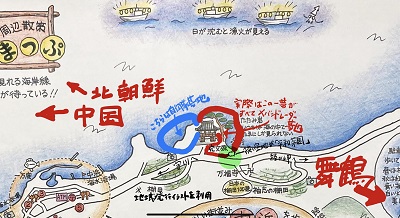 2021/3/29 稽古場近くの太宗寺さんの桜が満開…のようですが、まだ見ていません。稽古からの帰り道に一本の桜が夜桜風で思わずパシャリ。 さて、今回の舞台になるのは合併して京丹後市となった旧丹後町。 私は基地ウォッチャーで米軍基地建設反対運動をやっている元木明彦役。 基地に囲まれた文殊さんの御堂前の場面では、 どこに何があって、 ミサイルがどの方向から来ると想定しているのか、 舞鶴の基地やグアム島はどの方向か、 などを間違いなく指させるようにと苦労しています。 実際、世界地図で見てみると、 ここのレーダー基地がどんな役割を果たしているのか 具体的に想像できるようになりました。 今はネットで調べたり見たりできるので助かります。 稽古開始前に現地に伺った時いただいたイラストマップも活用しています。 ![]() 劇場入りまで3週間。台本片手に、演出の関根さん、 演出助手の清原さんと相談中なのは義理の妹役の湯本さん。