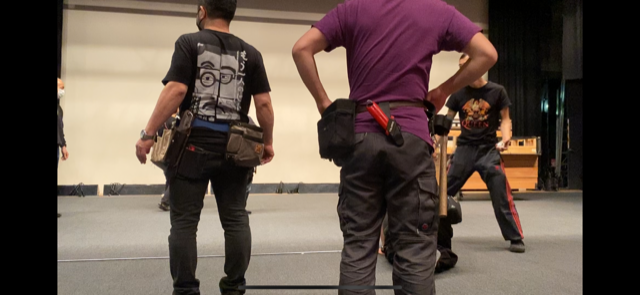 舞台監督の松橋さんの指揮のもと、搬入した大道具を建て込み、