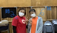 こんにちは、亮子おばさん役の湯本弘美です。稽古が始まる前にウォーミングアップにラジオ体操をしています。 一生懸命やるといい汗がかけますよ。 今日は私の姉、良子さん役の島野さんとツーショット、 姉妹の軽妙なやりとりをぜひお楽しみください。