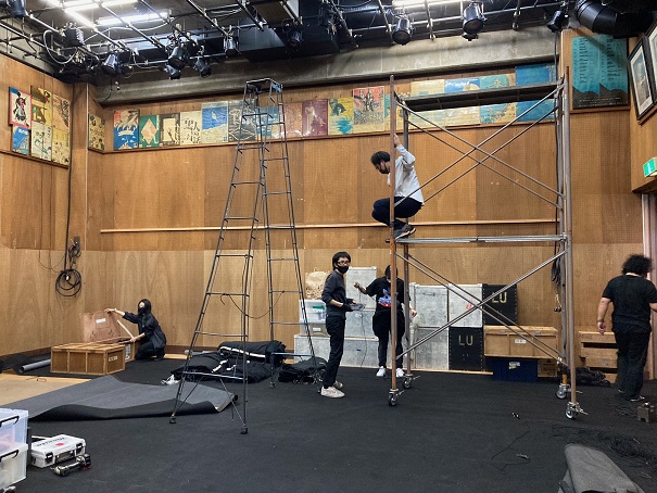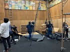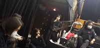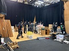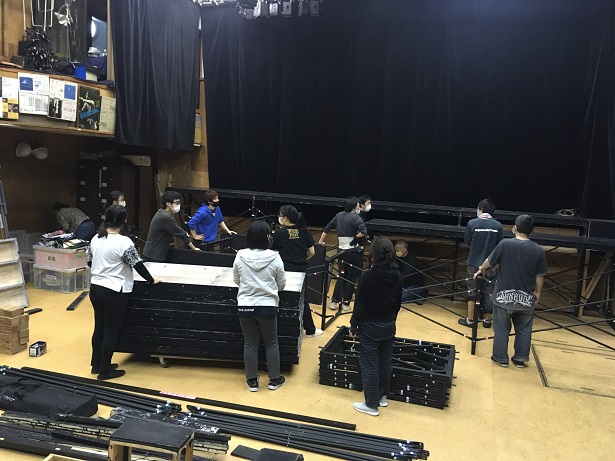 ![]() 本日は建て込み、客席作りの作業日です。 客席を組むと一気に稽古場が劇場に変化します。幕も吊って。