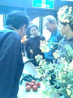 文化会館のロビーには、横須賀演劇鑑賞会の皆さんが飾ってくださった菜の花がいっぱい。花をはさんで、鑑賞会と劇団の顔合わせです。