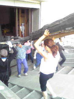 伊那市民劇場会員には、元劇団員と、以前青年劇場に客演してくれた(学校公演のスタッフにも参加してくださいました)方がいます。搬入・搬出、そして仕込みでも活躍してくれました。ARAKAWA Takayo