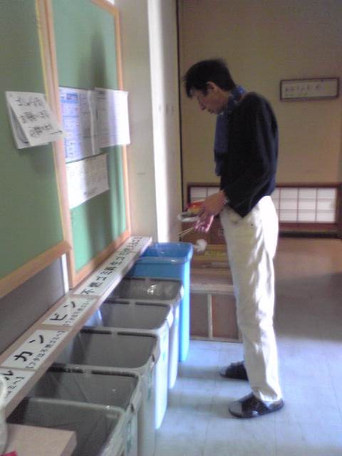 阿南市のゴミの捨て方は6分別。市民会館の楽屋に並ぶゴミ箱の前で、説明を読む広尾博。