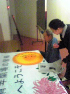 鳴門市民劇場の皆様が、手作りの横断幕で出迎えてくださいました。 お返しにサインをする出演者たち。