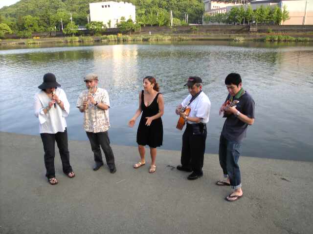 昼公演の後、有志による野外コンサートが開かれました。曲目は「花祭り」「コンドルは飛んでいく」の2曲!照明でお世話になっているライティングユニオンから横田元一郎さん、永友智美さんが参加。青年劇場から渡辺尚彦、清原達之が参加しヴォーカルはなんと客演のアンシア・フェインさんでした。気候も良く川をバックに高知の夕暮れを楽しみました。真喜志康壮