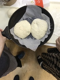 みんなで作業台を囲みながら、でも「あーでもない」「こーでもない」と和気あいあい楽しく作業しました(笑)フライパンで発酵させた生地です! けっこう膨らんだんですけど、写真だとなかなか伝わらない(´・ω・`)