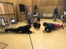 休憩時間にゲリラ的に行われる体幹部。 しりとりをしながら楽しくやっています。 今日は稽古前のアップでもやっている、お尻に必ず「ん」のつくしりとり。 「じかん」「かばん」「ばいおりん」… これがけっこう難しい。脳トレしながらの身体作りで一石二鳥です。