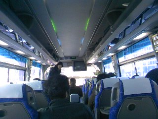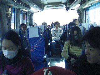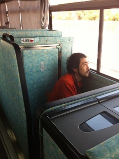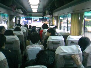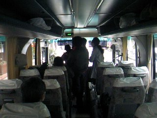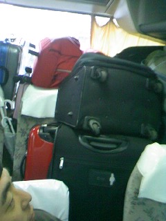 出発時、先輩達が見送ってくれました。 今回は一週間の旅(三島、浜松、菊川と周南、岡山)ということで、公演班一同大きめの荷物を抱え劇団のバスに…乗り込んだはいいもののご覧の状態に(-o-;)