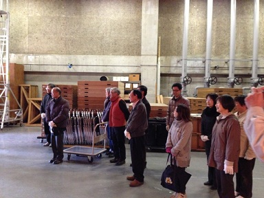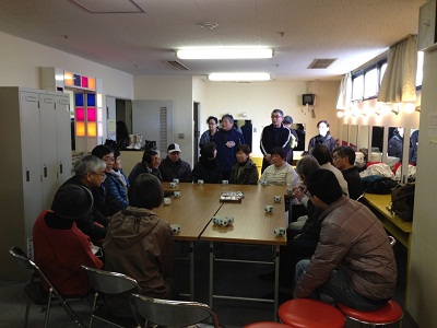 搬入前の諸注意は吉村さん。 搬入後には皆さんでティータイム。ちなみに、実行委員会は市民劇場の方や肥田舜太郎先生の映画を観るママの会で活動している若いお母さん達など、様々な分野の方々が集まって結成されたそうです。本当に今日まで有り難うございます!