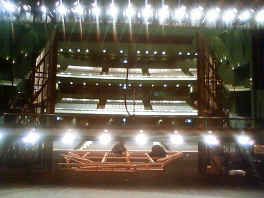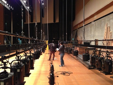 搬入をしている間に照明さん達はスポットの吊り込みをしています。 今回は独自に持ち込んだ機材が沢山あって普段よりもずっと大変なようです。