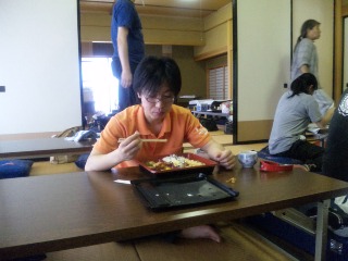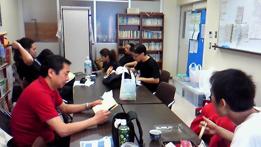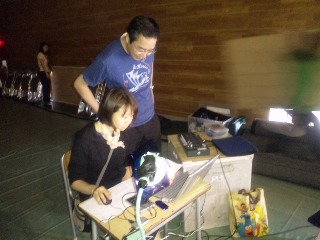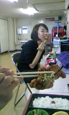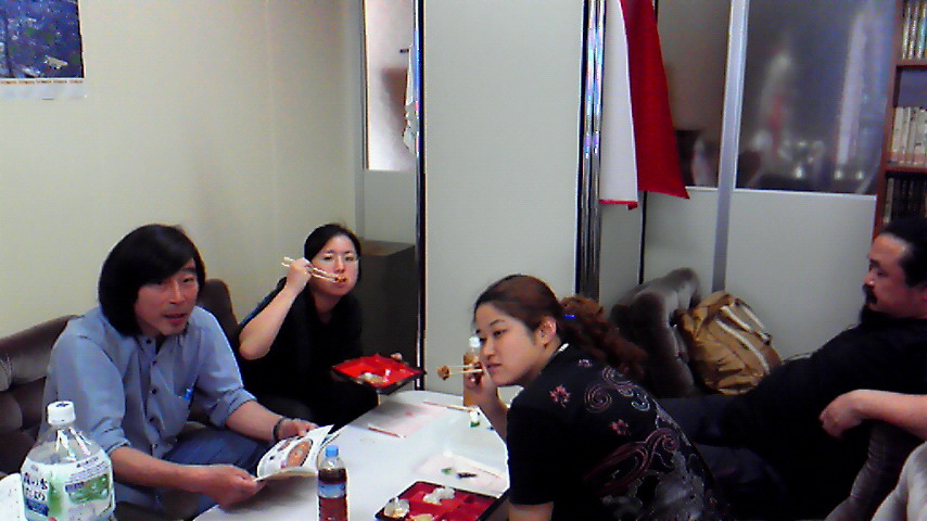 お弁当タイムの照明チーフ松浦さん(奥)とライティングユニオンの若井さん。