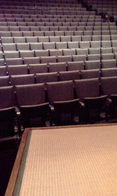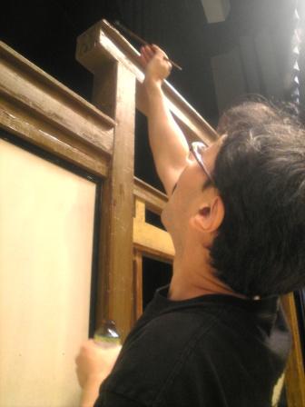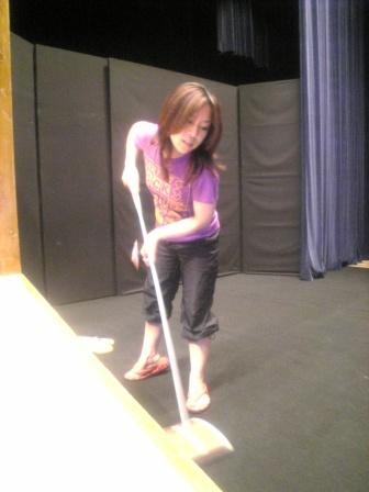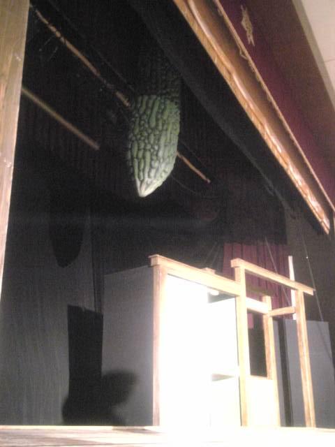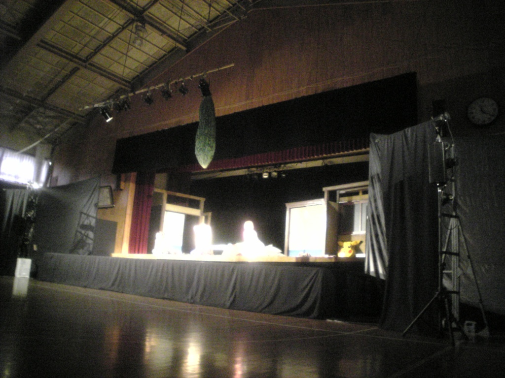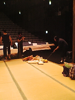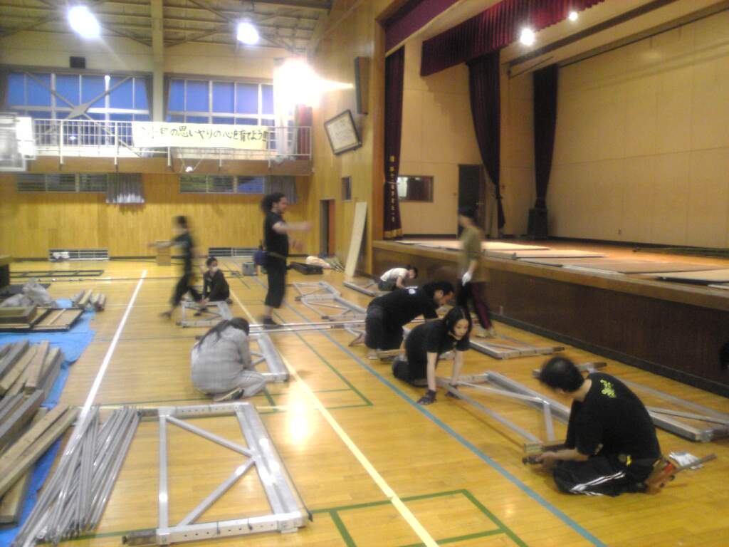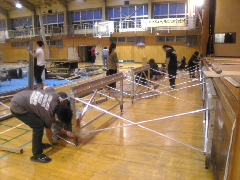 体育館のステージの奥行きでは、「ゴーヤーの間」は入りきらないので、「張り出し」といって舞台を付け足します。 組み立てていく様子は、こんなかんじ。