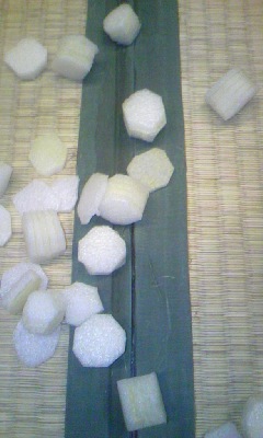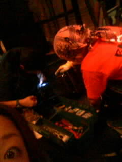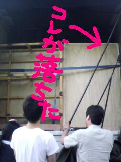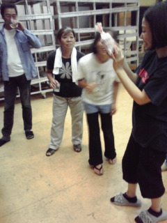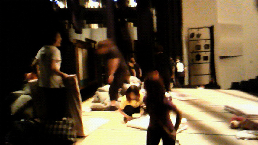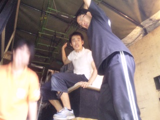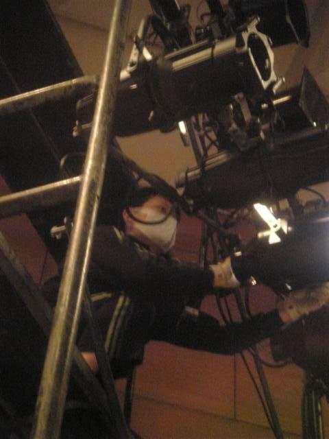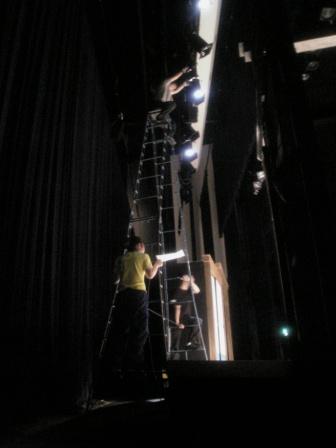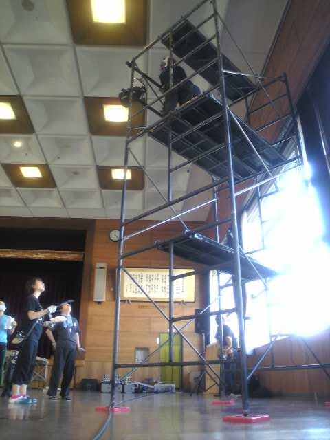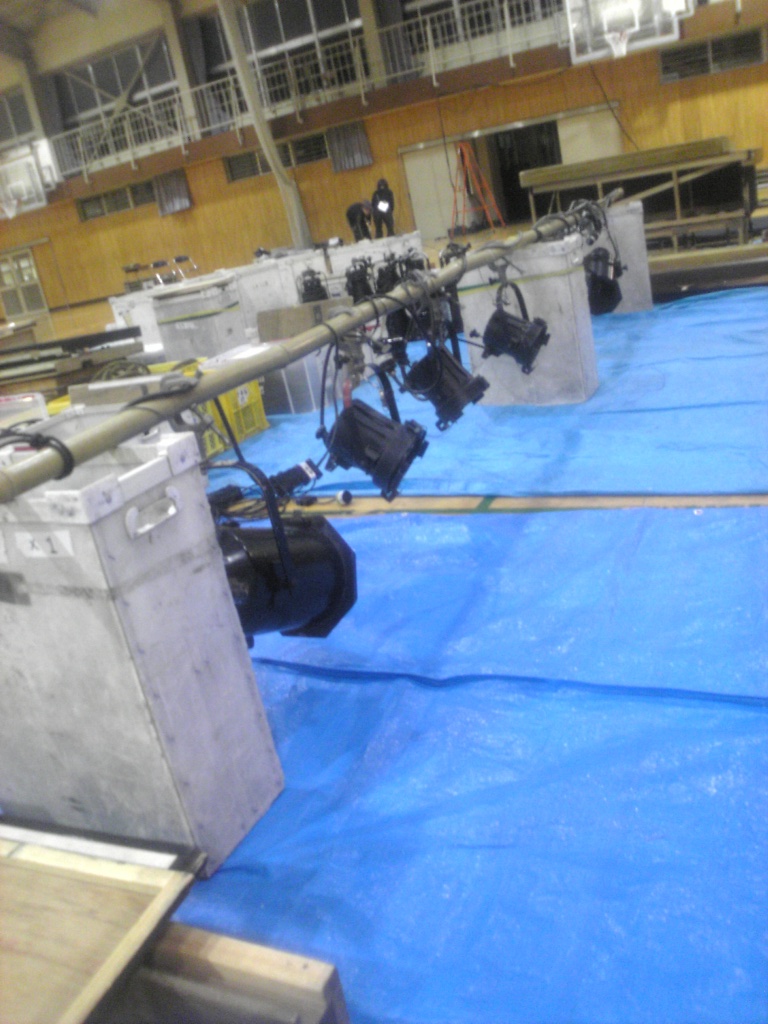 同時進行で、照明を吊り上げる準備が進んでいます。 太い竹竿に吊るして、このあとこれを天井くらいの高さまでロープで吊り上げます。