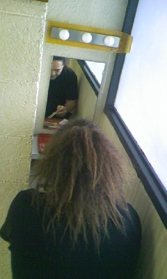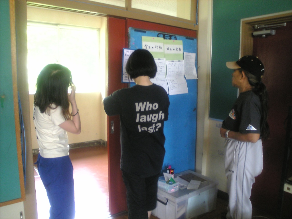 あ、楽屋の掲示板に、新情報が書かれるかな?!集まってきたチアキちゃん(本間)とおばあ。