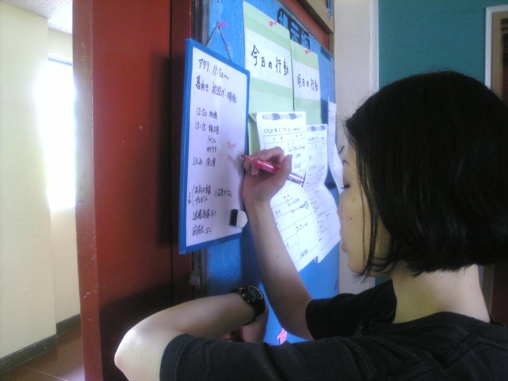 新情報はウォーミングアップの時間でした。記入するノミヤさん(大山)。