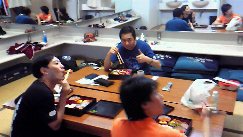 開演30分前の女性キャストの楽屋といえば、みんなメイクに余念のない様子に対し、男性キャストはメイクをしないので、ご覧の通りテーブルの上にはメイク道具がなく、本を読んだり、お弁当を食べたりと様々です。