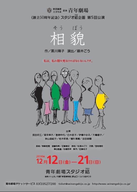 黒川陽子(くろかわようこ) 1983年生。早稲田大学大学院文学研究科修士課程修了(アーサー・ミラー研究)。 2007年、『ハルメリ』で第13回日本劇作家協会新人戯曲賞受賞。『どっきり地獄』『ロミオ的な人とジュリエット』『10978日目の鏡』など中短編戯曲を多数執筆するほか、ミュージカル脚本の作成、映像作品の企画・構成、評論文の寄稿、講演会への出演など、活動の幅を広げている。 |