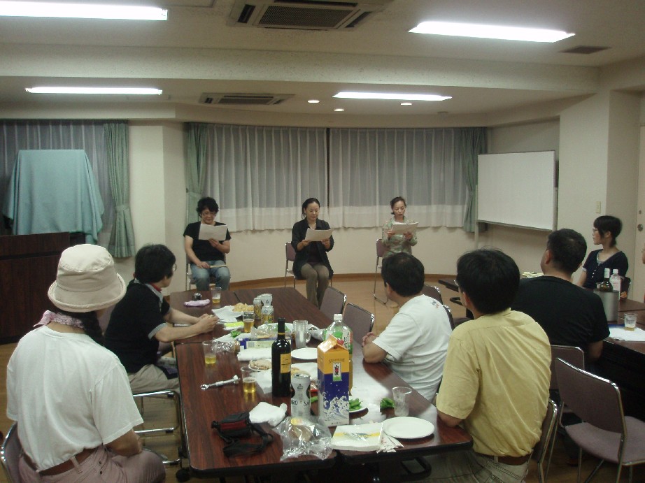 夜の交流会は居酒屋を借りきり、荒川貴代構成の『桃太郎』を、白木匡子・永田江里・蒔田祐子・菊本ちひろが朗読。稽古場からのかけつけ組も含め、劇団員10名、お客様11名、計21名でお大いに盛り上がりました。