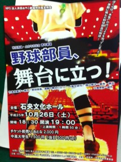 ![]() 2013/9/23 始まりました!「野球部員、舞台に立つ!」秋の巡演!!!「怒濤」の打ち上げの次の日から稽古を再開しまして(実は本番中にもしてたんですよ(⌒-⌒; ))、9月21日は稽古最終日で、岡本有紀さんの誕生日でもありましたーーー☆ ![]() でー、22日は倉庫で荷積みをしまして、 23日はゲネプロでした。 初演から70ステージ以上やってきまして、また新鮮でよりパワーアップした舞台を届けていきたいと思います!この秋のコースの何処かで100ステージを迎えます。邁進していきますよ〜 ☆*:.。. o(≧▽≦)o .。.:*☆ 武智香織 |