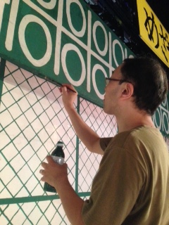 舞台ではセットを建てた後にハゲてしまった色を塗っているところです。 こちらは今回から初参加の高山くんです。彼は俳優さんですが、今回はスタッフで来てくれてます。