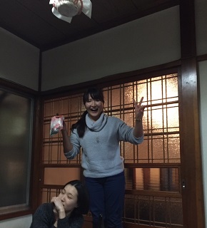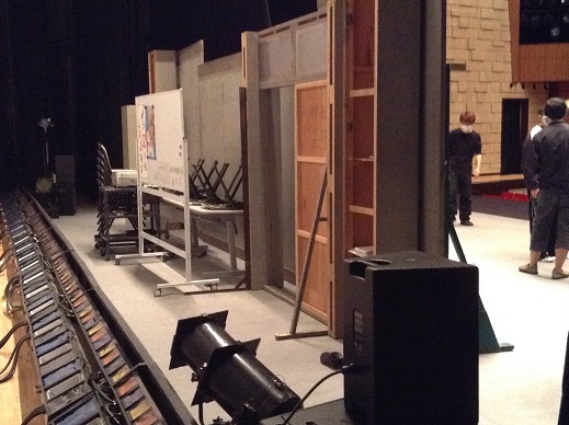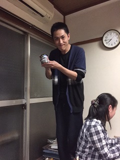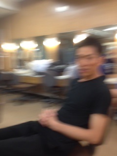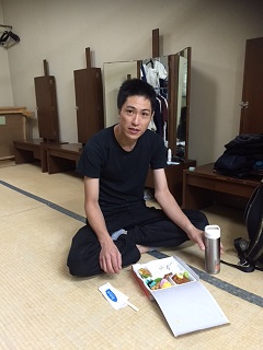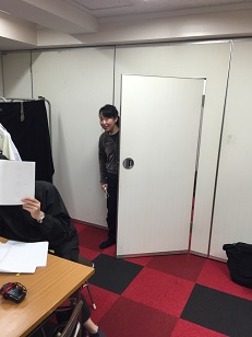 舞台の仕込みはとてもテンポ良く進みました。 こちらは男性楽屋です。 和室と洋室が両方使えるいい感じの楽屋ですね。 奥で仕事してるのは「トモキ」役の船津くんです。