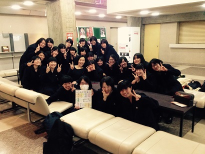 2015/12/16 本日の東京都立大山高等学校さんの座談会報告をします!事前に演劇部の生徒さんから参加希望があると伺っていたのですが、ロビーに行くと演劇部、軽音部、バレー部、和太鼓部等々、想像以上の生徒さんが集まってくれていました!すごく嬉しい!!(>▽<) 発声のこと、役作りのこと、他にどんな役についてるか等の質問から、ジュンペーとトモキが面白かった!等など、温かい嬉しい感想も沢山頂きました。 エリの気持ちに共感したと言ってくれた生徒さんや、本当の高校生が演劇をしているみたいで、ロビーに出てきた時に年齢が分からなかったと言ってくれる生徒さんも…!!((◎-◎;)) 司会をお願いした生徒さんから、『芝居に興味のなかった友達が、今日観劇して、芝居って面白いと言ってくれて、嬉しかった』と話してくれたのが、とても印象的でした。 ![]() 側で座談会を見守ってくれていた先生も言うように、客席の生徒さん達が舞台への集中を切らすことなく観劇してくれたお陰で、私達も楽しんで芝居が出来ました! 最後は集合写真を撮って、笑顔でお別れ。最後まで、挨拶もしっかり。素敵です。 写真、光の具合で見辛くなってしまってるところがありました…すみません(T-T) 大山高等学校の皆さん、本当にありがとうございました!! カナ(藤代梓) |