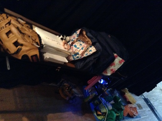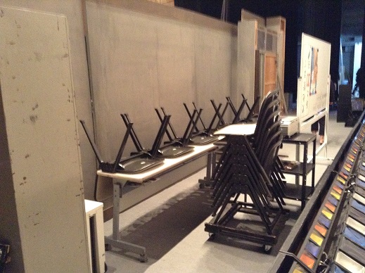 今日はバックネット裏の紹介。教室の椅子や机などがスタンバイしています。 袖幕後ろには早替えの衣装が着替えやすいような状態で置かれ小道具も机の上に並べられています。本番が始まるとこれらが舞台で活躍!?します!!