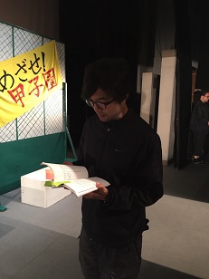 ![]() 朝公演の前のウォーミングアップ 2015/11/20 船津です。九州公演がひと段落しました。本日は2ステージ。佐賀県鳥栖市の県立鳥栖工業高等学校さんと県立鳥栖商業高等学校さんが観てくれました。カーテンコールでは代表の生徒さんが緊張した声で「他人を尊重する事の大切さに気づきました。」と挨拶されました。 ![]() 僕は“台車”…仕事が始まる時と 終わった時の荷積みの時以外はた だ壁にもたれかかっているだけ… 人によってはゴロゴロ、とかゴロ! と呼ばれています。今日はなぜか スポットライト浴びています。 暇だな… 座談会の模様はエリ役の武智さんから報告してもらいまーす。 ![]() 今日のボードの落書きは原田 先輩の似顔絵。一人ジャンケン して…るわけではなく250回 を表現しています。 さて、本日の公演で「野球部員、舞台に立つ!」は通算250ステージ目達成しました!! *\(^o^)/**\(^o^)/**\(^o^)/* おめでとうございます! ![]() で、その似顔絵を描いた高山君 に花束。なぜ? さぁ、残された公演も頑張っていくよ〜! 船津基 |