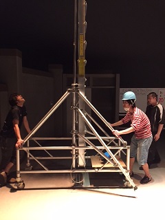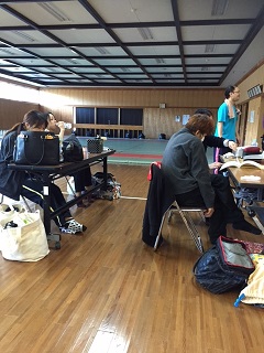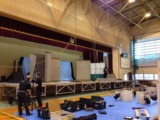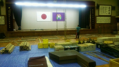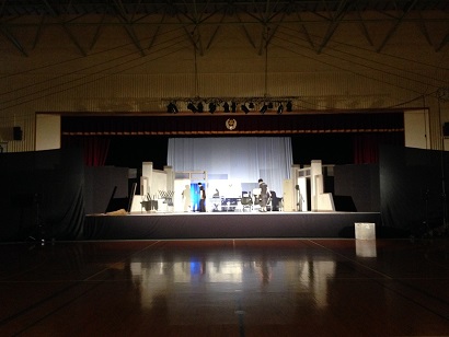 二階の体育館を劇場にするため、前日から仕込みです。せっせっせー! 鹿児島県、暑いよー。28度!公演班のみんなは汗だくです(-_-)