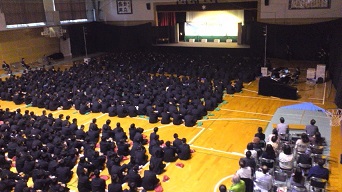 さてさて、体育館が劇場になりましたよー(*◎-◎*) 国分高校では『3年生を励ます会』が恒例行事だそうです。これは、これから受験をむかえる3年生へ、1,2年生が企画を練って発表するもので、上演前に披露されました。音楽部の演奏と1,2年生全員の合唱は感動!!舞台袖で私、涙、涙。本番前なのにー(T_T) 素敵な生徒さん達だー。 公演もとてもよく観てくれて、舞台上でドキドキしましたよー。 バラシ(後片付けのこと)もたくさんの生徒さんが手伝ってくれました!雨のなかありがとう!! 九州はよかとこばい。人も気温もあったかい(^^)