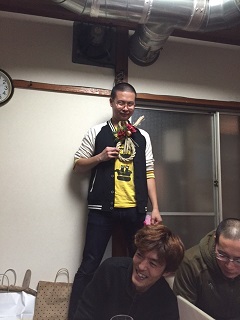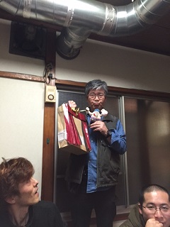あれ?こんなピンクシャツの人いたっけ?博士班に着いている矢野貴大(36才・大阪生まれ)が、自宅から自転車で1時間かけて仕込みの手伝いに来てくれたのです。 ![]() ありがとう。ありがとう。 久しぶりだね、矢野ちゃんよ。 終わったら、ちゃんと1時間かけて帰るんだよ。 ![]() あれ?みんな何してる? ![]() そうか〜、明かりつくりに付き合っているんだね。 いつもは、本番準備があるから、こんなに人はいないんだ。 みんながいるって、いいね。 ![]() 12/16【朝公演】 朝早いのに、劇団員が続々と駆けつけてくれました。他にも沢山の方々。キャストは、緊張感を持って本番に臨みました。 Q.それは…劇団員が来たから? A.いいえ。それは関係ありません。いつも緊張感を持って臨んでいます。全身全霊を傾けて芝居をしています! だから、、、 バラシ(片付け)はヘトヘト。。。 「はっ!今日は仲間が来ている!」 「おいっ!みんなが、バラシ手伝ってくれるってよ!」 「なんだって!?そりゃ有り難し!」 お陰様で、「あっ!」という間に終わりました。ありがとう。ありがとう。 みんながいるって、いいね。 ![]() 【翌日の公演の為、御殿場に移動】 宿で、みんなで御飯。九州・各地域の子ども劇場さんから頂いたプレゼントを皆んなで分け合いっこ。 ![]() 《その節は、大変お世話になりました。ありがとうございました。》と、思っていたのも束の間。 ![]() 「あれが欲しい!」 「これも欲しい!!」 ![]() ワイワイガヤガヤ。 サンバデルンバ。 「わかった。わかった。じゃあ、ジャンケンで決めよう!」 ![]() お好みのプレゼントを頂いてホクホク笑顔。 大いに盛り上がりました。